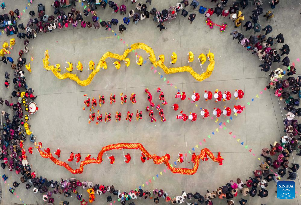 An aerial drone photo taken on March 20, 2026 shows a dragon dance performance during a traditional temple fair in Xiaxi Village of Taizhou, east China's Jiangsu Province. The spring equinox falls on March 20. This year, it also marks Longtaitou, also known as Dragon Head-raising Day, a significant occasion in the lunar calendar, celebrated by various activities across China. (Photo by Tang Dehong/Xinhua)