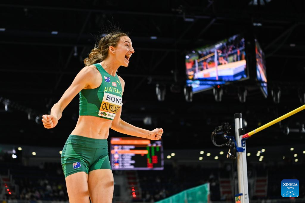 Nicola Olyslagers of Australia celebrates during the women's high jump final at the 2026 World Athletics Indoor Championships in Torun, Poland, March 20, 2026. [Xinhua/Zhang Haofu]