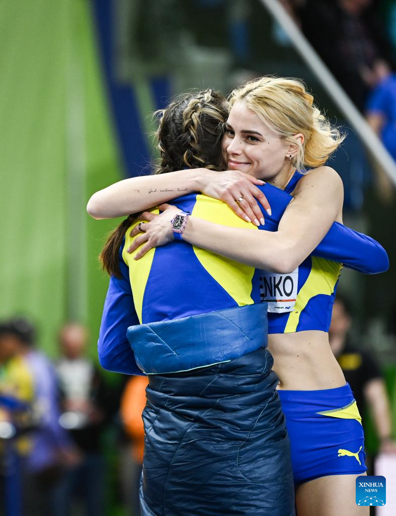 Yuliia Levchenko (R) and Yaroslava Mahuchikh of Ukraine celebrate during the women's high jump final at the 2026 World Athletics Indoor Championships in Torun, Poland, March 20, 2026. [Xinhua/Zhang Haofu]