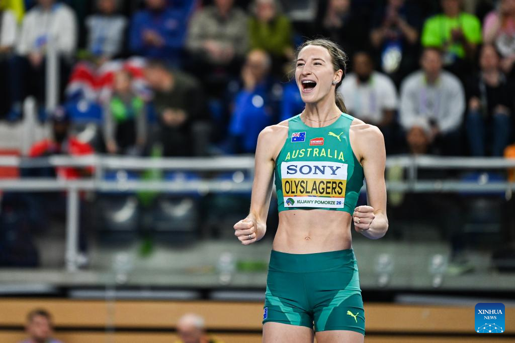 Nicola Olyslagers of Australia interacts with the spectators during the women's high jump final at the 2026 World Athletics Indoor Championships in Torun, Poland, March 20, 2026. [Xinhua/Zhang Haofu]