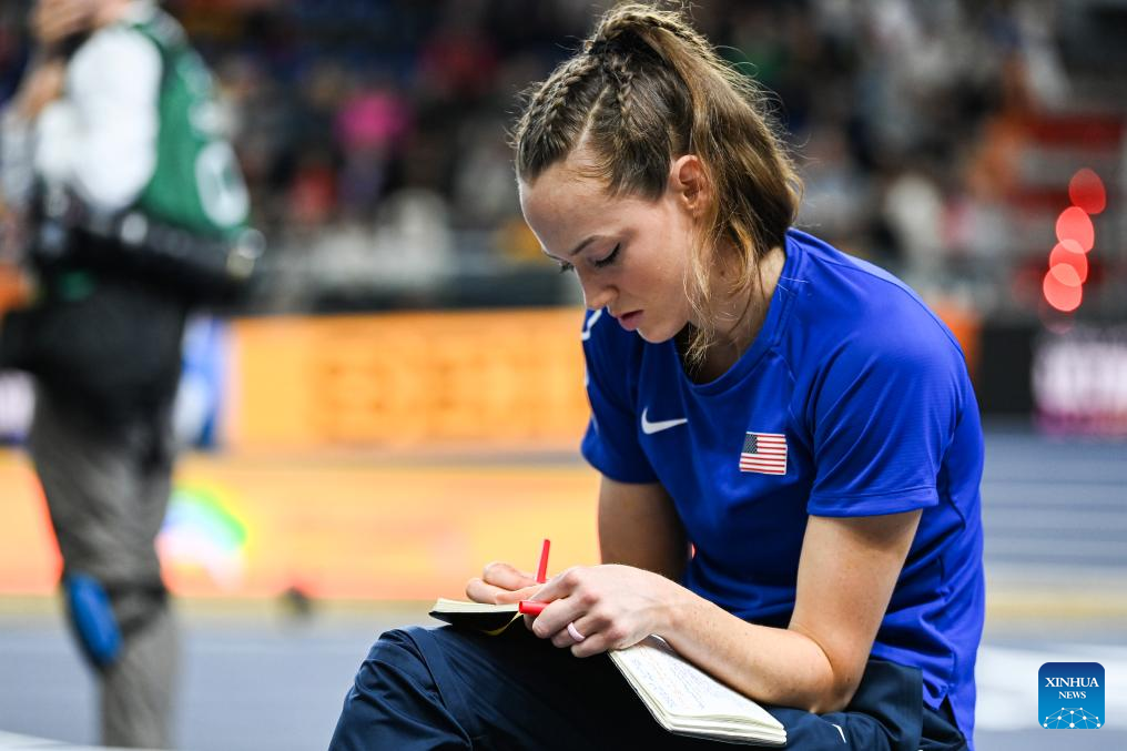 Charity Hufnagel of the United States take notes during the women's high jump final at the 2026 World Athletics Indoor Championships in Torun, Poland, March 20, 2026. [Xinhua/Zhang Haofu]