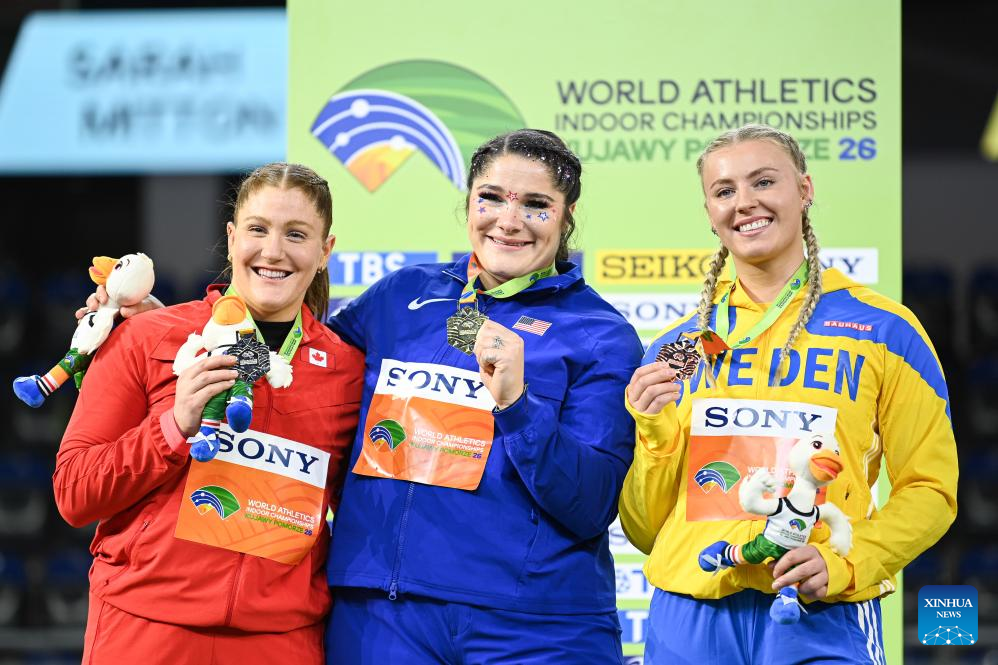 Gold medalist Chase Jackson (C) of the United States, silver medalist Sarah Mitton (L) of Canada and bronze medalist Axelina Johansson of Sweden pose for photograph during the awarding ceremony of the women's shot put final at the 2026 World Athletics Indoor Championships in Torun, Poland, March 20, 2026. [Xinhua/Zhang Haofu]