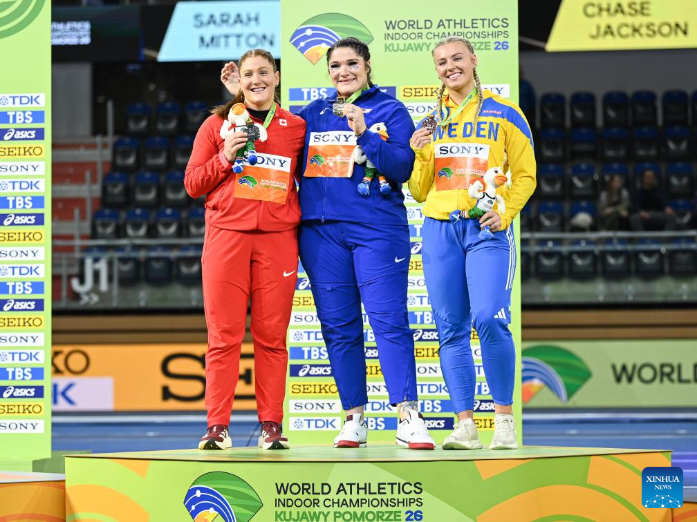 Gold medalist Chase Jackson (C) of the United States, silver medalist Sarah Mitton (L) of Canada and bronze medalist Axelina Johansson of Sweden pose for photograph during the awarding ceremony of the women's shot put final at the 2026 World Athletics Indoor Championships in Torun, Poland, March 20, 2026. [Xinhua/Zhang Haofu]