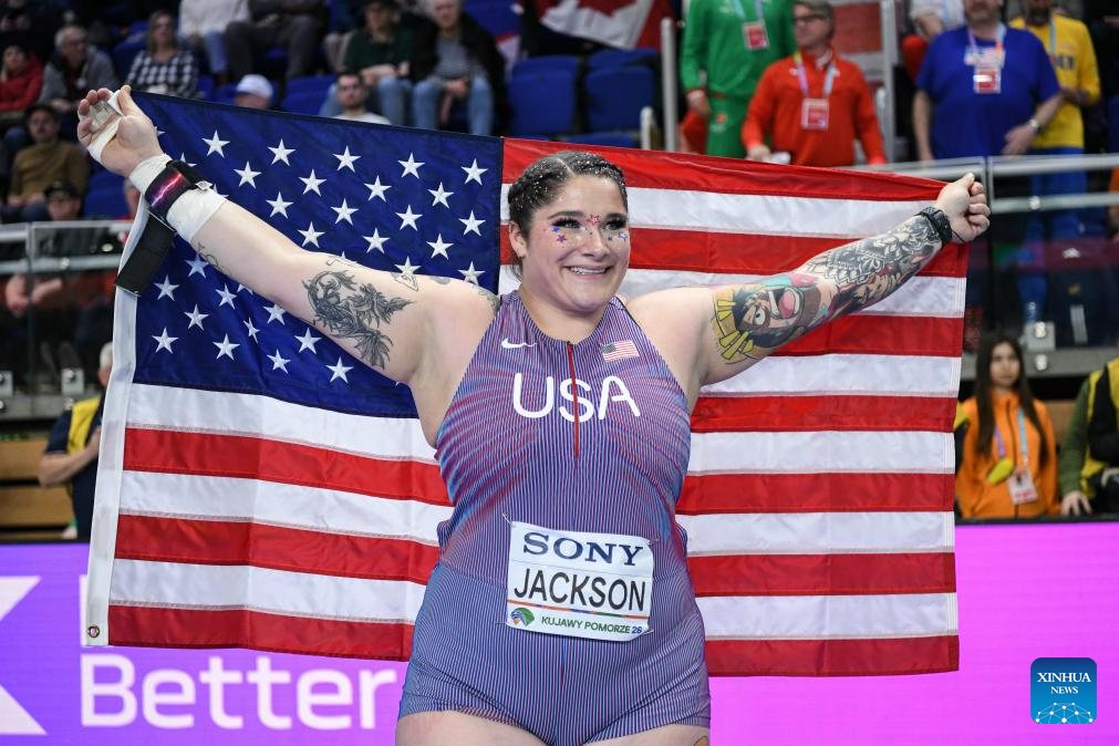 Chase Jackson of the United States celebrates after winning the women's shot put final at the 2026 World Athletics Indoor Championships in Torun, Poland, March 20, 2026. [Xinhua/Zhang Haofu]