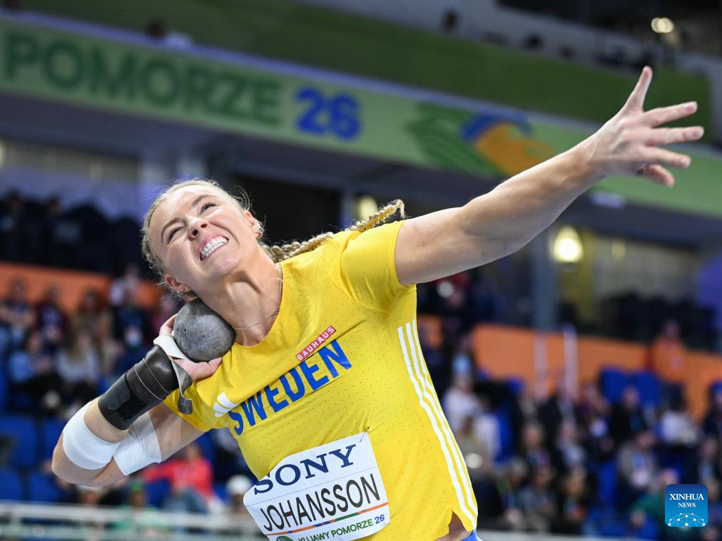 Axelina Johansson of Sweden competes during the women's shot put final at the 2026 World Athletics Indoor Championships in Torun, Poland, March 20, 2026. [Xinhua/Zhang Haofu]