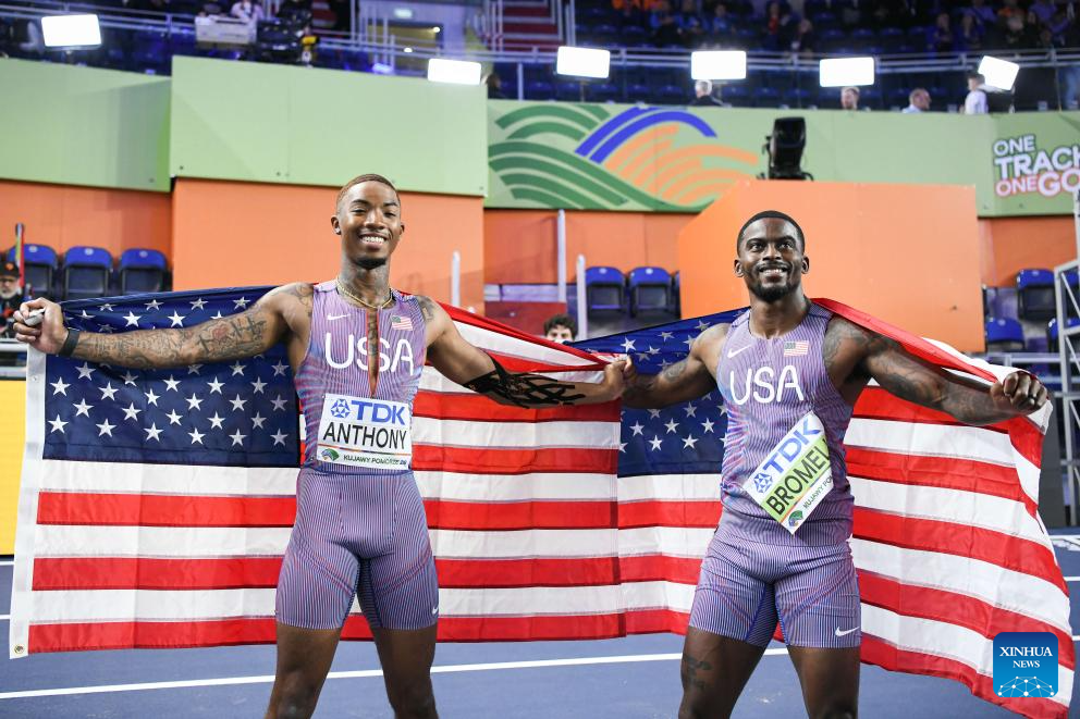 Jordan Anthony (L) and Trayvon Bromell of the United States celebrate after the men's 60m final at the 2026 World Athletics Indoor Championships in Torun, Poland, March 20, 2026. [Xinhua/Zhang Haofu]