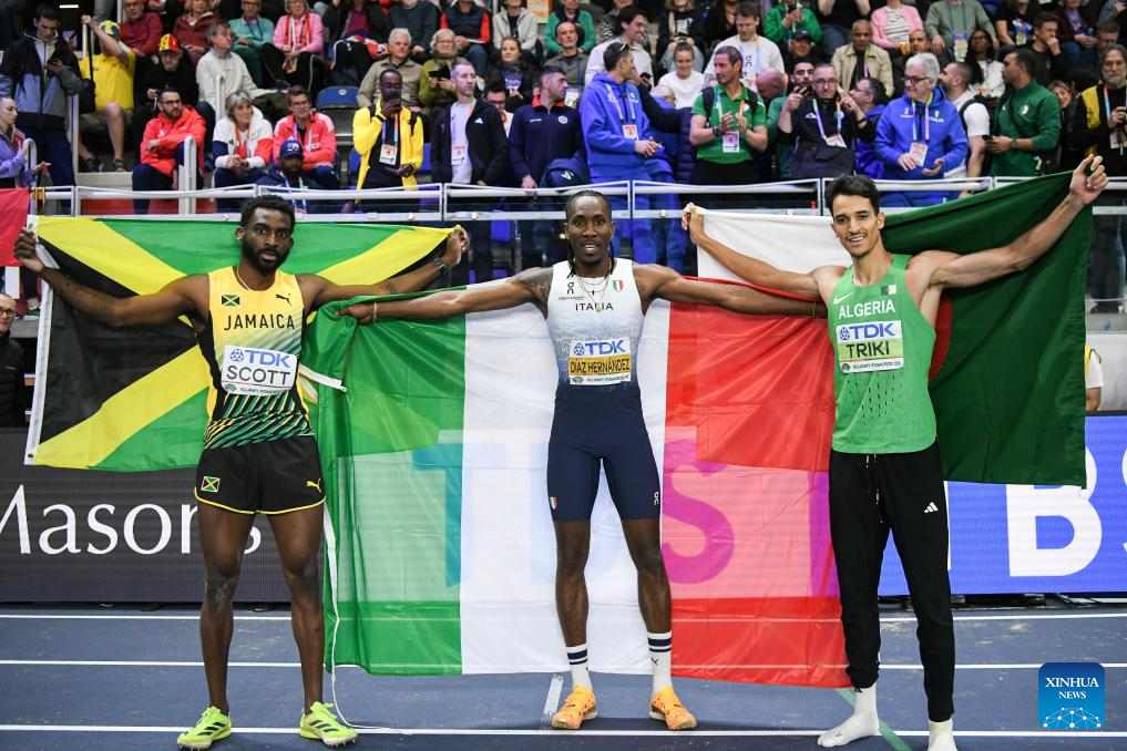 Andy Diaz Hernandez (C) of Italy, Jordan Scott (L) of Jamaica and Yasser Mohammed Triki of Algeria celebrate after the men's triple jump final at the 2026 World Athletics Indoor Championships in Torun, Poland, March 20, 2026. [Xinhua/Zhang Haofu]