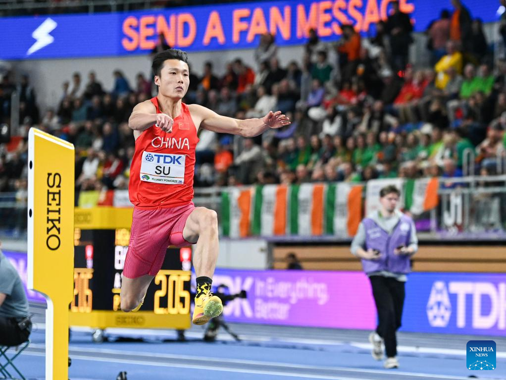 Su Wen of China competes during the men's triple jump final at the 2026 World Athletics Indoor Championships in Torun, Poland, March 20, 2026. [Xinhua/Zhang Haofu]