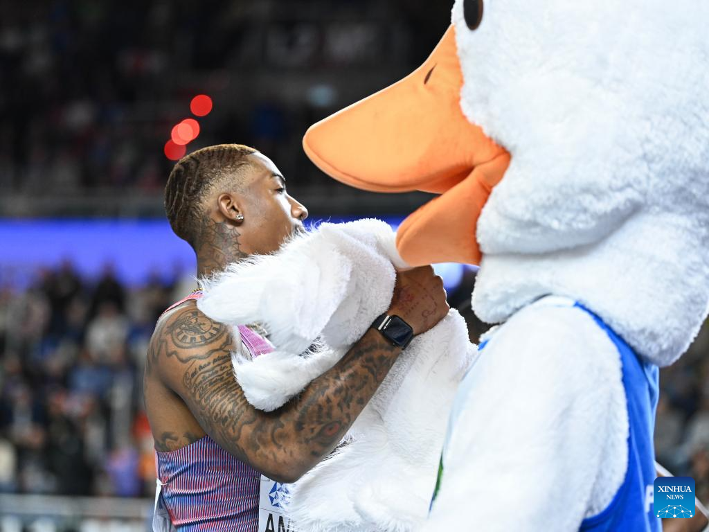 Jordan Anthony (L) of the United States celebrates with the mascot after winning the men's 60m final at the 2026 World Athletics Indoor Championships in Torun, Poland, March 20, 2026. [Xinhua/Zhang Haofu]