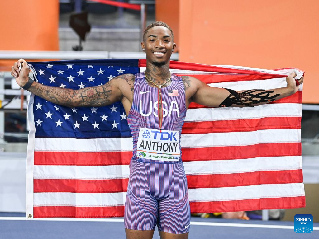 Jordan Anthony of the United States celebrates after winning the men's 60m final at the 2026 World Athletics Indoor Championships in Torun, Poland, March 20, 2026. [Xinhua/Zhang Haofu]