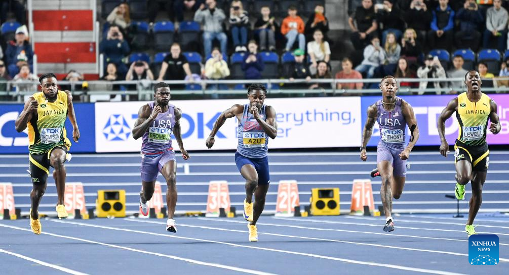 (L-R)Kishane Thompson of Jamaica, Trayvon Bromell of the United States, Jeremiah Azu of Britain, Jordan Anthony of the United States and Bryan Levell of Jamaica compete during the men's 60m final at the 2026 World Athletics Indoor Championships in Torun, Poland, March 20, 2026. [Xinhua/Zhang Haofu]