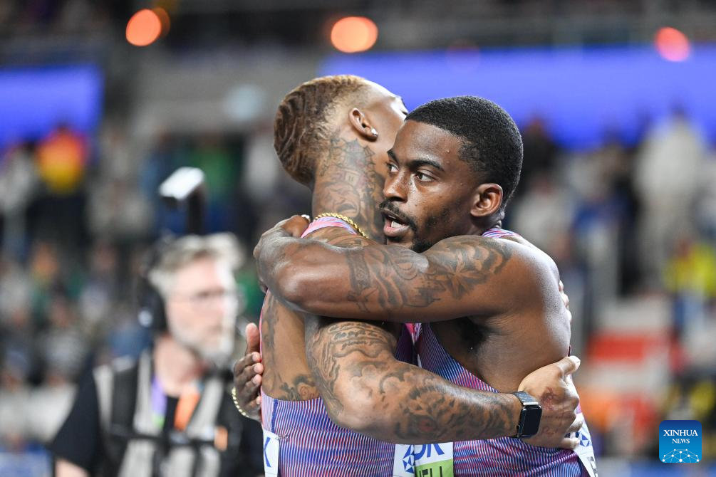Jordan Anthony (L) and Trayvon Bromell of the United States celebrate after the men's 60m final at the 2026 World Athletics Indoor Championships in Torun, Poland, March 20, 2026. [Xinhua/Zhang Haofu]