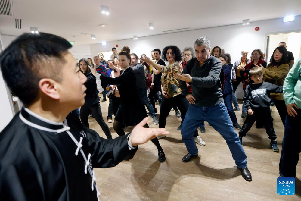 Romanians practice Taijiquan, a kind of Chinese traditional martial arts, with a Chinese master during an International Taijiquan Day event at the Chinese Cultural Center in Bucharest, Romania, March 20, 2026. A lecture ahead of the first International Taijiquan Day was held on Friday at the Chinese Cultural Center in Bucharest.