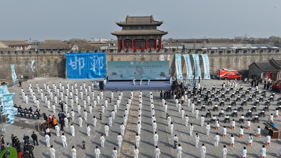 A drone photo taken on March 21, 2026 shows a mass demonstration event of Taijiquan, a kind of Chinese traditional martial arts, in Yongnian District of Handan City, north China's Hebei Province. (Photo/Xinhua)
