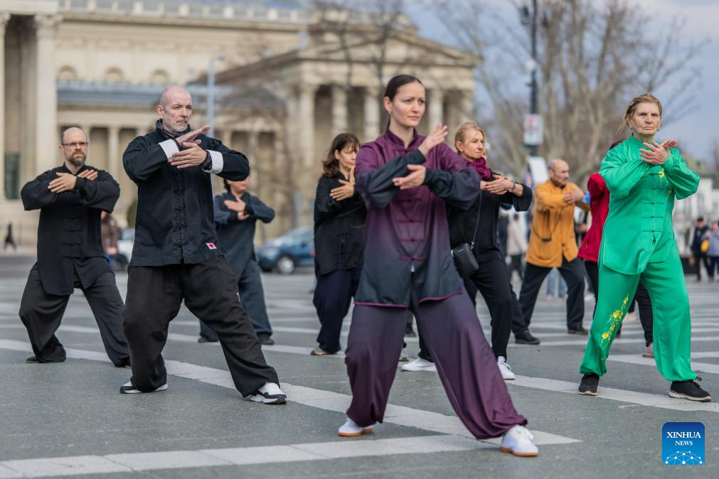 Taijiquan enthusiasts perform during the celebration event in Budapest, Hungary, on March 21, 2026. (Photo/Xinhua)