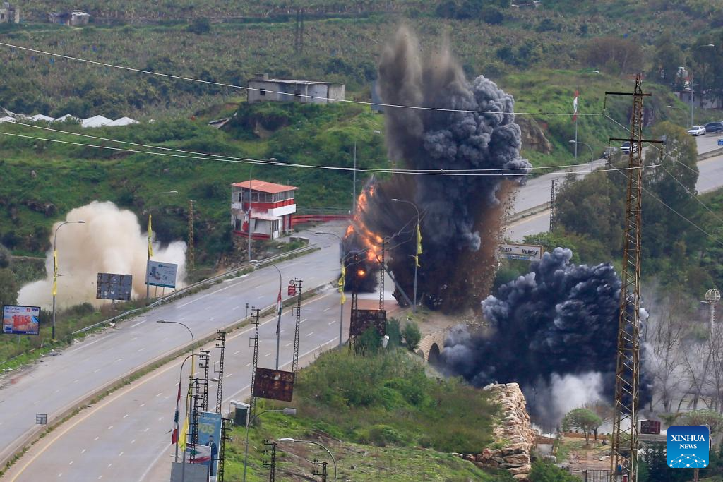 This photo taken on March 22, 2026 shows an explosion during an Israeli airstrike on a bridge over the Litani River in Qasmiyeh, southern Lebanon. [Photo/Xinhua]