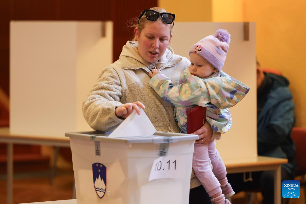 A voter casts her ballot during the 2026 Slovenian parliamentary election at a polling station in Radomlje, Slovenia, March 22, 2026. [Photo/Xinhua]