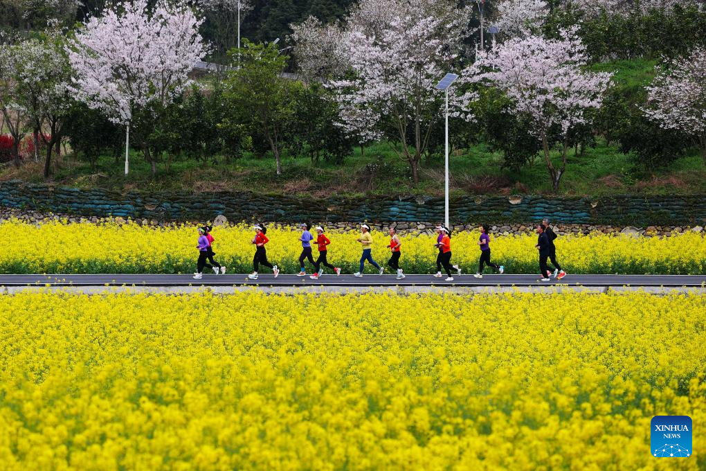 People jog at an agricultural demonstration park in Lizi Village, Taiji Town, Qianjiang District, southwest China's Chongqing, March 22, 2026. People step outdoors and embrace nature as spring unfolds across China. (Photo by Yang Min/Xinhua)