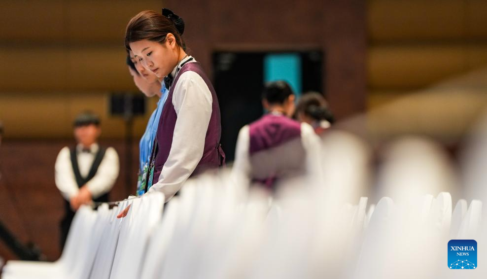 Staff members work at the main venue for the Boao Forum for Asia Annual Conference 2026 in Boao Town of Qionghai City, south China's Hainan Province, March 23, 2026. The Boao Forum for Asia Annual Conference 2026 is scheduled to be held in Boao from March 24 to 27. [Xinhua/Yang Guanyu]