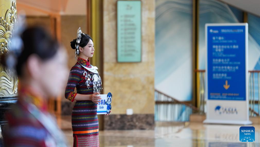 Guides in costumes of Li ethnic group are pictured at the Boao Forum for Asia (BFA) hotel in Boao Town of Qionghai City, south China's Hainan Province, March 23, 2026. The Boao Forum for Asia Annual Conference 2026 is scheduled to be held in Boao from March 24 to 27. [Xinhua/Yang Guanyu]