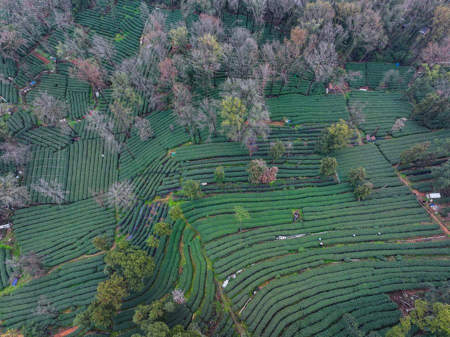 An aerial drone photo shows tea farmers picking tea leaves in Meijiawu village in Hangzhou, east China's Zhejiang Province, March 19, 2026. [Photo/Xinhua]