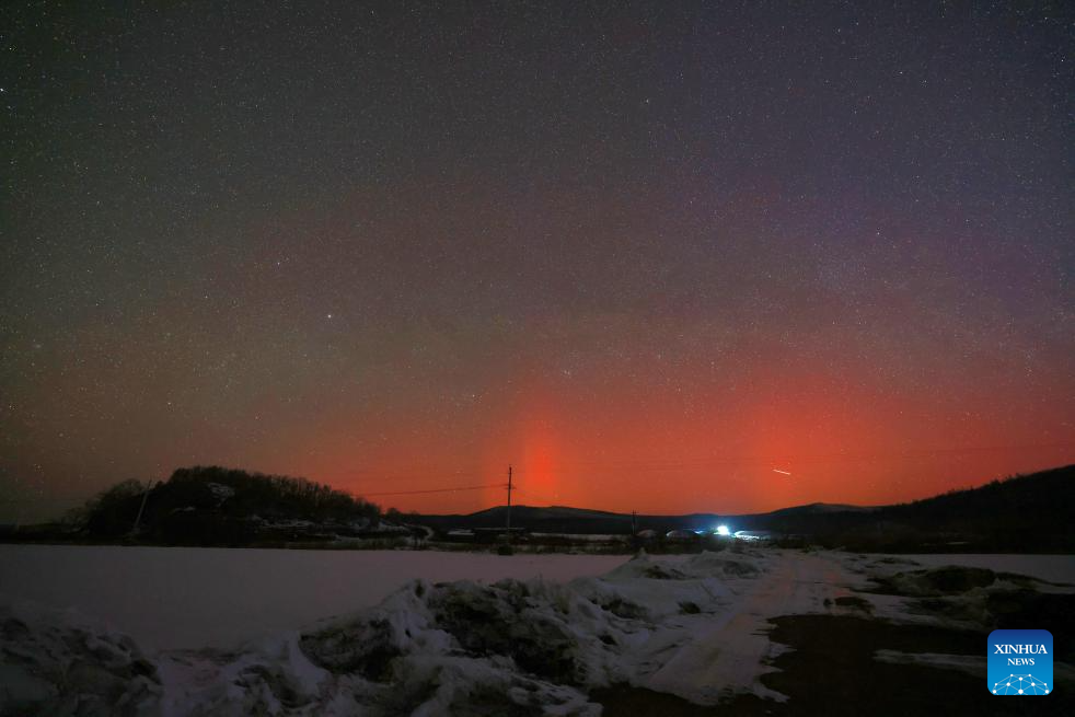 This photo taken on March 23, 2026 shows the aurora observed from Jiagedaqi, northeast China's Heilongjiang province. Due to the influence of geomagnetic activities, many places in Heilongjiang province witnessed splendid auroras from the night of March 22 to the early morning of March 23. (Photo by Zhuang Yu/Xinhua)