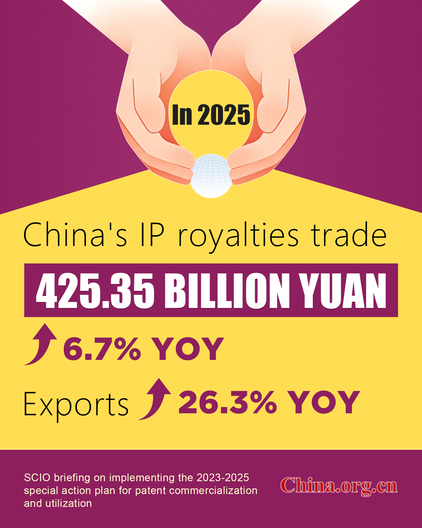China's total imports and exports of intellectual property (IP) royalties reached 425.35 billion yuan (US$61.82 billion) in 2025, up 6.7% year on year, with exports surging 26.3% as domestically developed innovations expand overseas, according to Hu Wenhui, deputy commissioner of the China National Intellectual Property Administration.