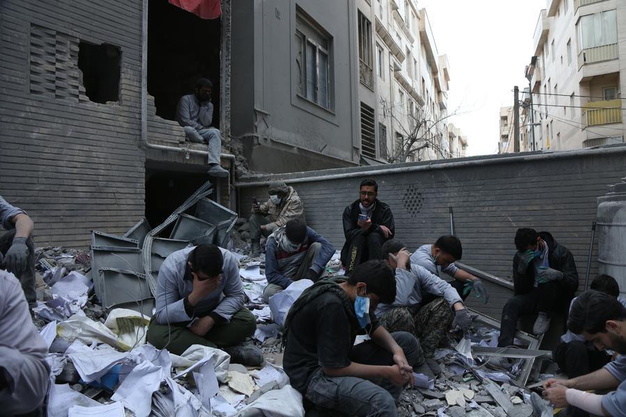 People sit on the debris of destroyed buildings at a residential area in Tehran, Iran, March 15, 2026. [Photo/Xinhua]