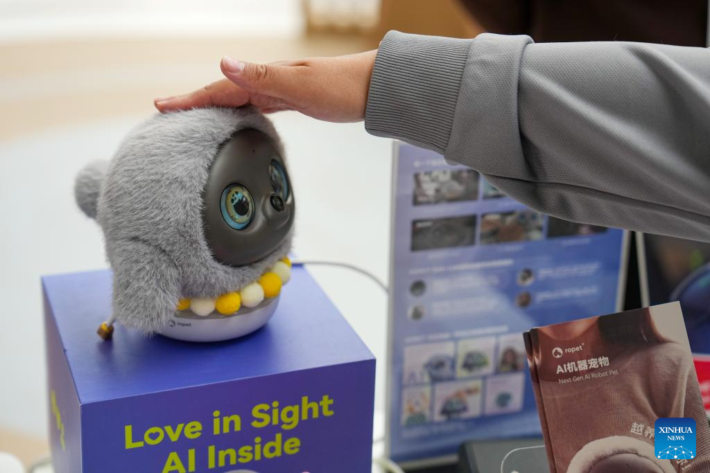 A visitor interacts with a robot pet at the Zhongguancun International Innovation Center in Beijing, capital of China, March 24, 2026. (Xinhua/Ju Huanzong)