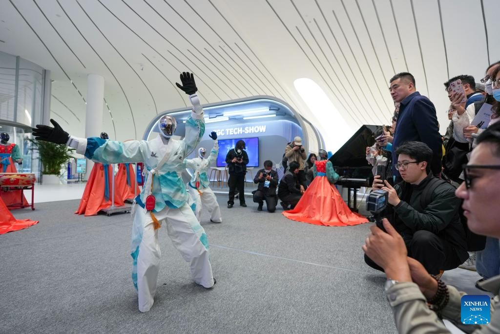 Robots stage a performance at the Zhongguancun International Innovation Center in Beijing, capital of China, March 24, 2026. (Xinhua/Ju Huanzong)