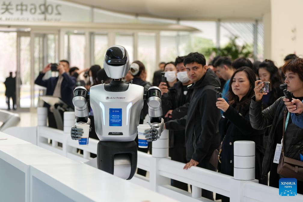 A humanoid robot serves drinks at the Zhongguancun International Innovation Center in Beijing, capital of China, March 24, 2026. (Xinhua/Ju Huanzong)