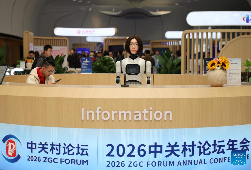 This photo taken on March 24, 2026 shows a humanoid robot at an information desk of the Zhongguancun International Innovation Center in Beijing, capital of China. (Xinhua/Zhang Chenlin)