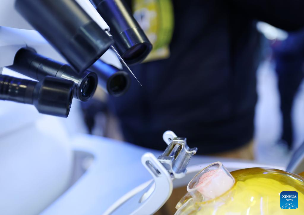 This photo taken on March 24, 2026 shows a high-throughput invasive brain-computer interface system at the Zhongguancun Exhibition Center in Beijing, capital of China. (Xinhua/Zhang Chenlin)
