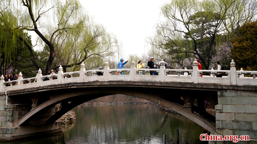 Visitors stroll along a stone bridge at the Summer Palace in Beijing, March 24, 2026. [Photo by Xu Xiaoxuan/China.org.cn]
