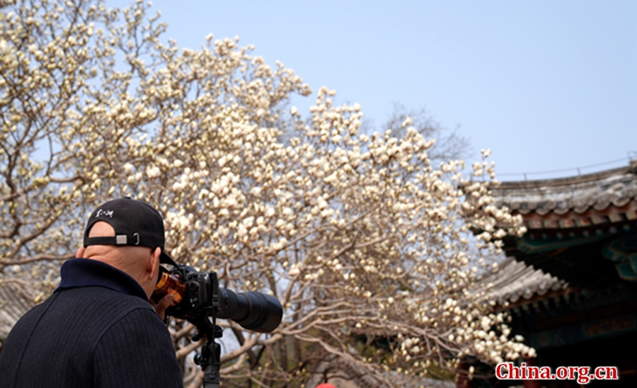 A visitor photographs magnolias in full bloom at the Summer Palace in Beijing, March 24, 2026. [Photo by Xu Xiaoxuan/China.org.cn]