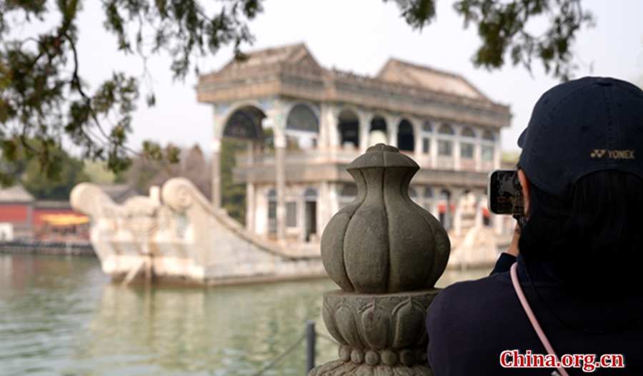 A visitor photographs the marble boat at the Summer Palace in Beijing, March 24, 2026. [Photo by Xu Xiaoxuan/China.org.cn]