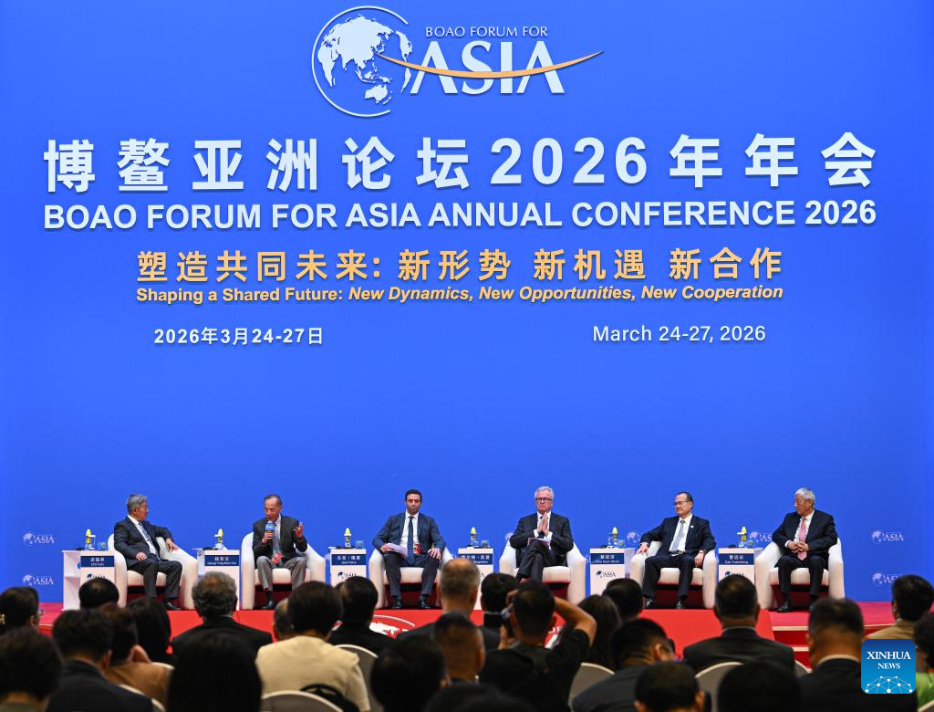 This photo taken on March 24, 2026 shows a view of a panel discussion themed on "Free Trade Ports: Opportunities and Missions as Gateways for Opening-up" during the Boao Forum for Asia (BFA) Annual Conference 2026 in Boao, south China's Hainan Province. (Xinhua/Pu Xiaoxu)