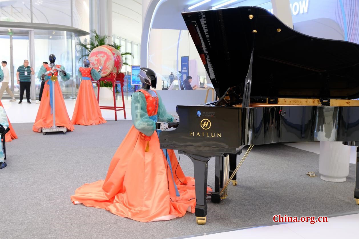 A humanoid robot dressed in traditional attire plays piano at the 2026 ZGC Forum, March 25, 2026. [Photo by Chen Xinyan/China.org.cn]