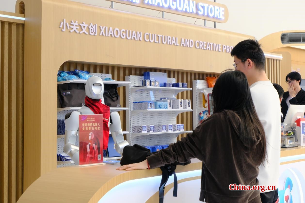 A humanoid robot assists customers at the cultural and creative product store at the 2026 ZGC Forum, March 25, 2026. [Photo by Chen Xinyan/China.org.cn]