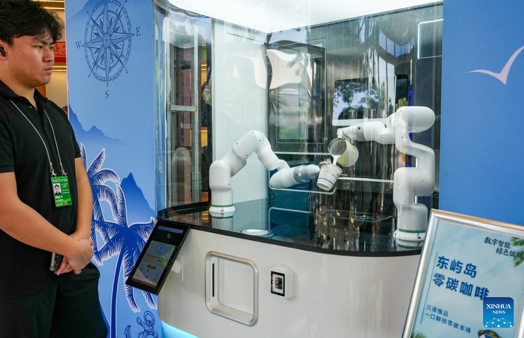 A robotic arm makes coffee for guests at Dongyu Island of Boao Town, Qionghai City of south China's Hainan Province, March 24, 2026. (Xinhua/Liu Lianfen)