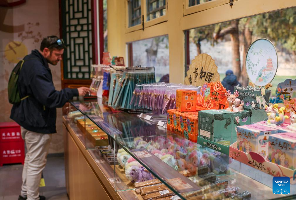 A man selects cultural and creative products at the Summer Palace in Beijing, capital of China, March 23, 2026. (Xinhua/Zhang Fan)