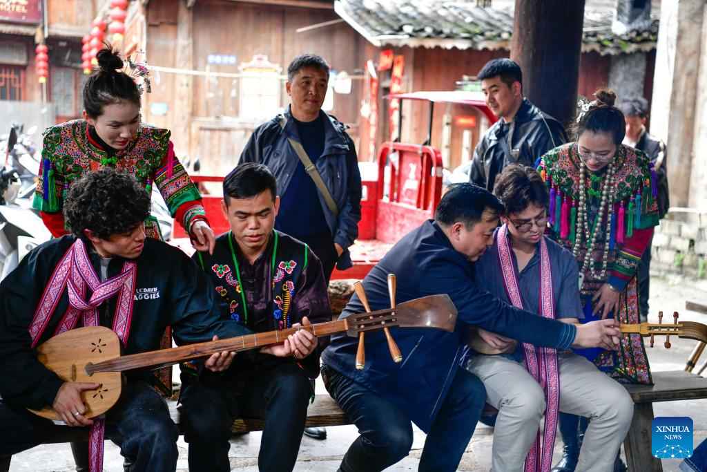 Members of the Whiffenpoofs a cappella choir of Yale University learn to play pipa of the Dong ethnic group at Zhaoxing Dong Village of Liping County, southwest China's Guizhou Province, March 23, 2026. The Whiffenpoofs a cappella choir of Yale University visited Liping County in southwest China's Guizhou Province from March 23 to 24 for cultural exchange activities. (Xinhua/Yang Wenbin)