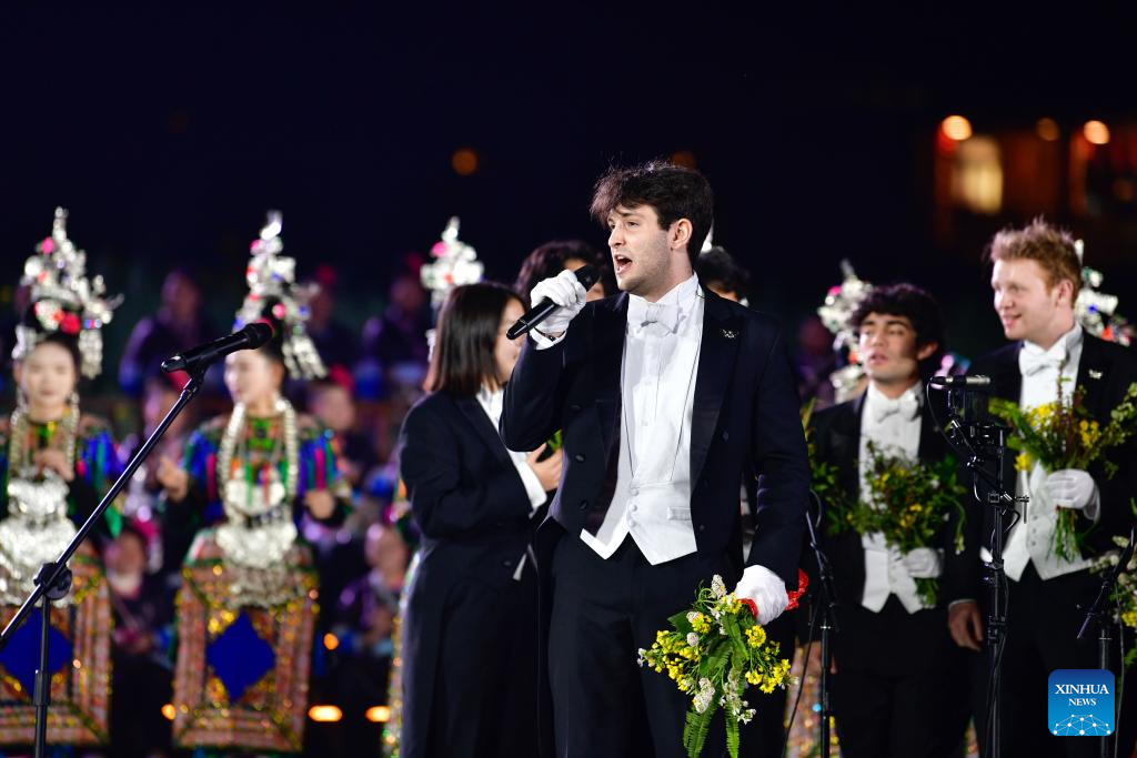 A member of the Whiffenpoofs a cappella choir of Yale University sings at Zhaoxing Dong Village of Liping County, southwest China's Guizhou Province, March 23, 2026. The Whiffenpoofs a cappella choir of Yale University visited Liping County in southwest China's Guizhou Province from March 23 to 24 for cultural exchange activities. (Xinhua/Yang Wenbin)