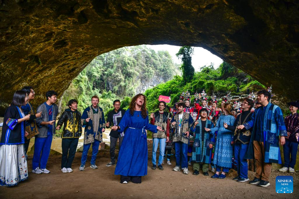 Members of the Whiffenpoofs a cappella choir of Yale University sing a song at a scenic area in Liping County, southwest China's Guizhou Province, March 24, 2026. The Whiffenpoofs a cappella choir of Yale University visited Liping County in southwest China's Guizhou Province from March 23 to 24 for cultural exchange activities. (Xinhua/Yang Wenbin)