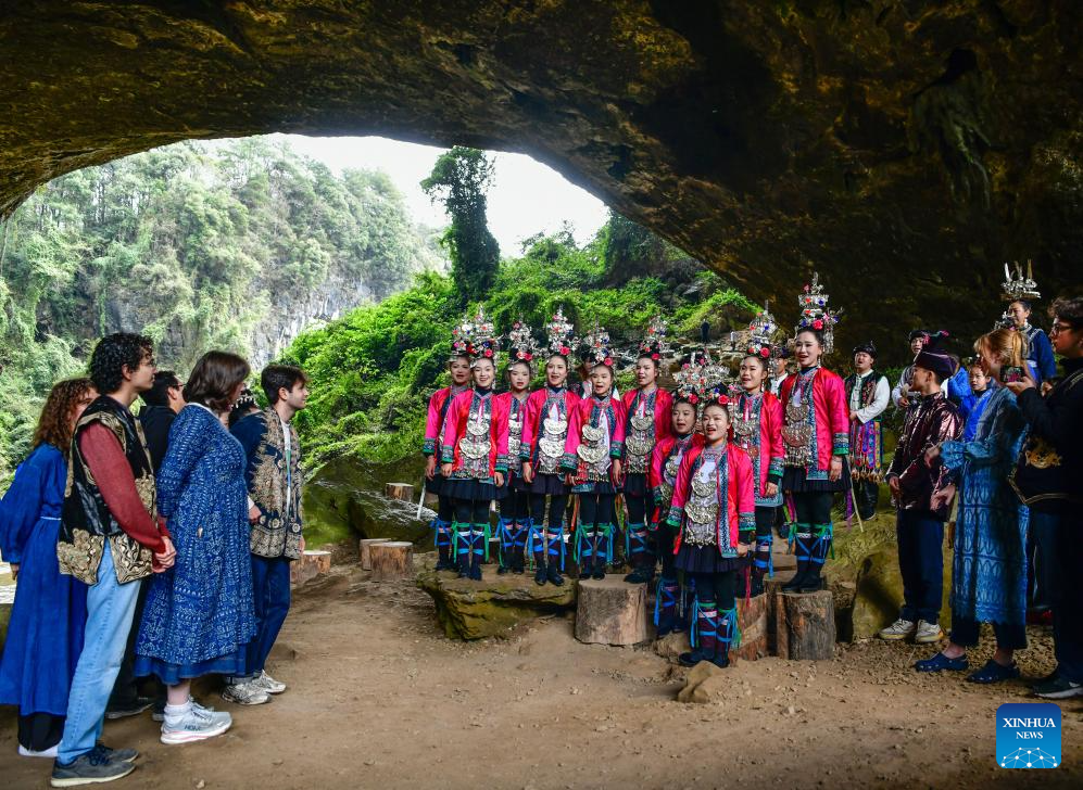 Performers sing a grand song of the Dong ethnic group at a scenic area in Liping County, southwest China's Guizhou Province, March 24, 2026. The Whiffenpoofs a cappella choir of Yale University visited Liping County in southwest China's Guizhou Province from March 23 to 24 for cultural exchange activities. (Xinhua/Yang Wenbin)