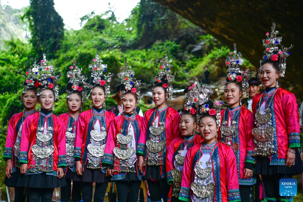 Performers sing a grand song of the Dong ethnic group at a scenic area in Liping County, southwest China's Guizhou Province, March 24, 2026. The Whiffenpoofs a cappella choir of Yale University visited Liping County in southwest China's Guizhou Province from March 23 to 24 for cultural exchange activities. (Xinhua/Yang Wenbin)