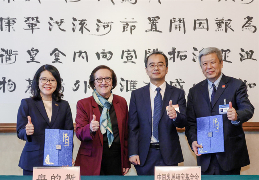 Sally Loh, president of Otis Greater China (first from left), Judy Marks, Otis chair, CEO and president (second from left), Zhang Liang, party secretary and secretary general of CDRF (third from left), and Qiao Zhenyang, deputy secretary general of CDRF (fourth from left), attend the signing ceremony for the Otis–CDRF vocational training partnership during the China Development Forum in Beijing, March 23, 2026. [Photo courtesy of Otis]