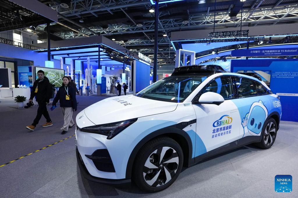 A self-driving vehicle is displayed at the permanent exhibition at the Zhongguancun Exhibition Center in Beijing, capital of China, March 24, 2026. (Xinhua/Ju Huanzong)