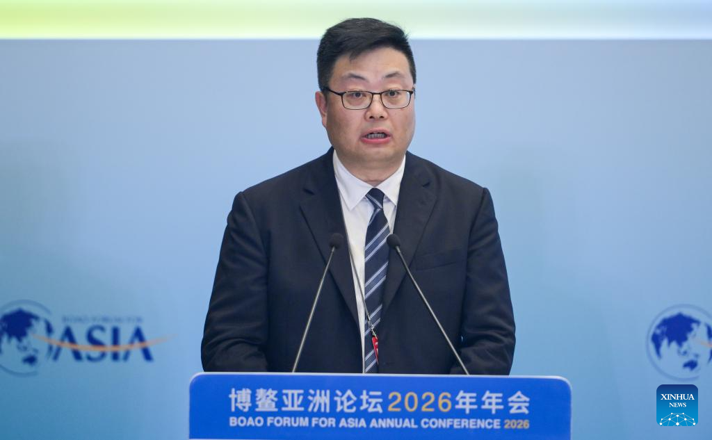 Zhang Feng, executive vice president of China COSCO Shipping Corporation Limited, speaks at a panel discussion themed on "Blue Economy: New Drivers for Marine Growth and New Future for Ports and Shipping" during the Boao Forum for Asia (BFA) Annual Conference 2026 in Boao, south China's Hainan Province, March 26, 2026. (Xinhua/Yang Guanyu)