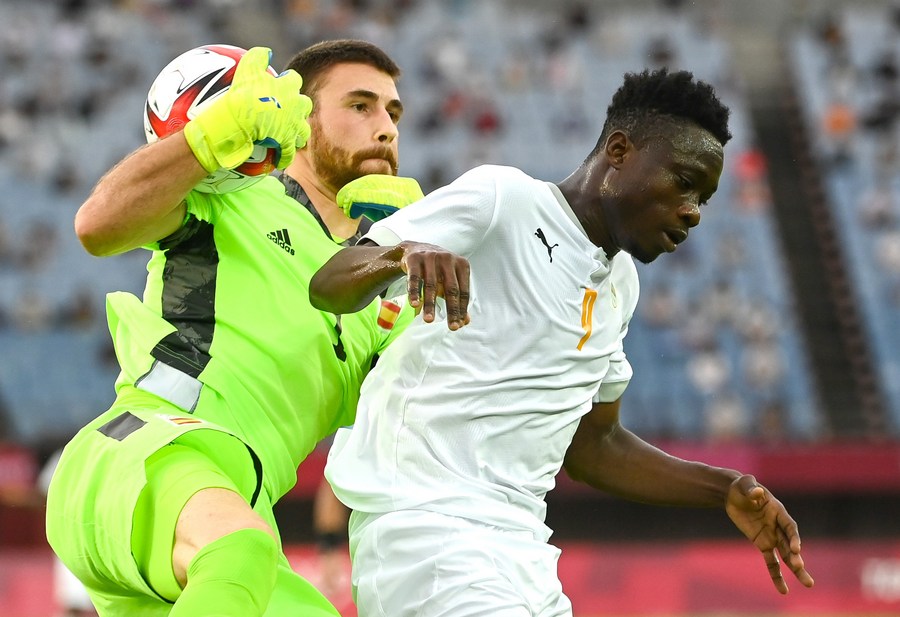 Unai Simon (L) of spain makes a save over Youssouf Dao of Cote d'Ivoire during the men's quarterfinal at the Tokyo 2020 Olympic Games in Miyagi, Japan, July 31, 2021. (Xinhua/Lu Yang)